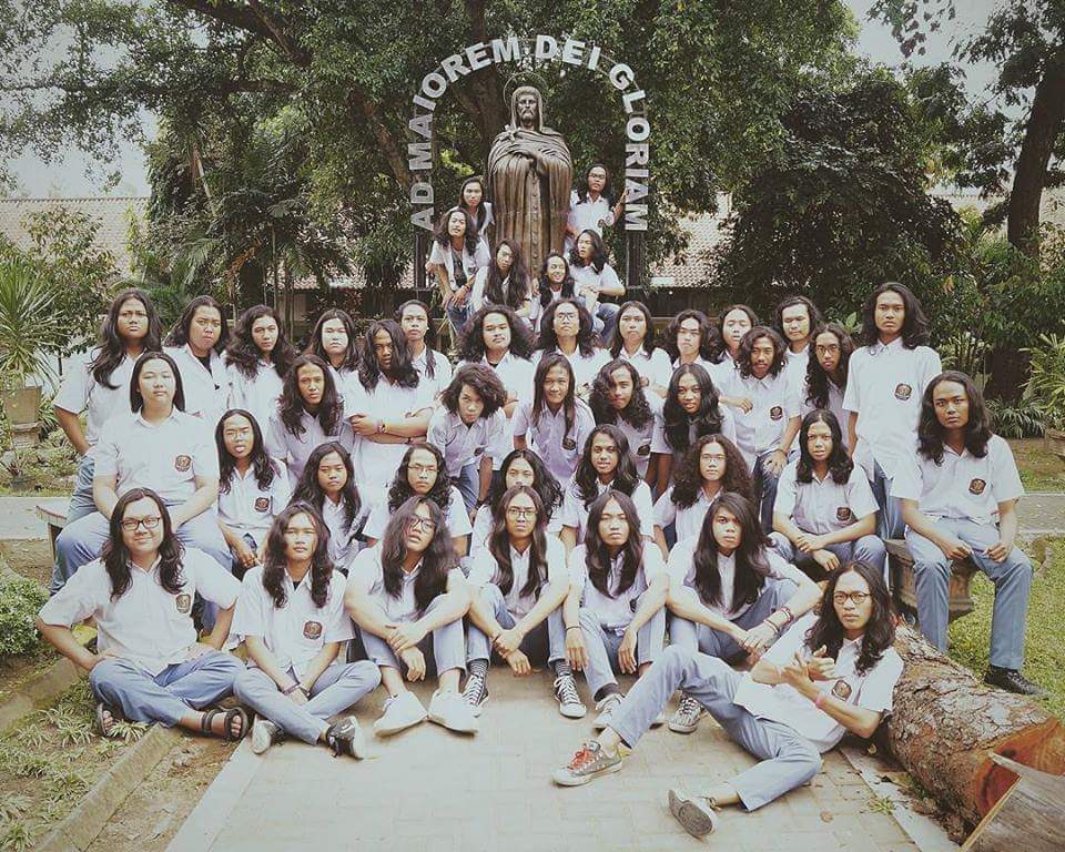 DE BRITTO | Di atas ini foto anak-anak Kolese de Britto, sebuah SMA swasta di Yogyakarta, sekolah khusus untuk anak cowok. Foto tersebut menjelaskan sedikit keunikan sekolah ini. Para siswa boleh gondrong, persis seperti seseorang yang dipatungkan di belakang mereka itu.