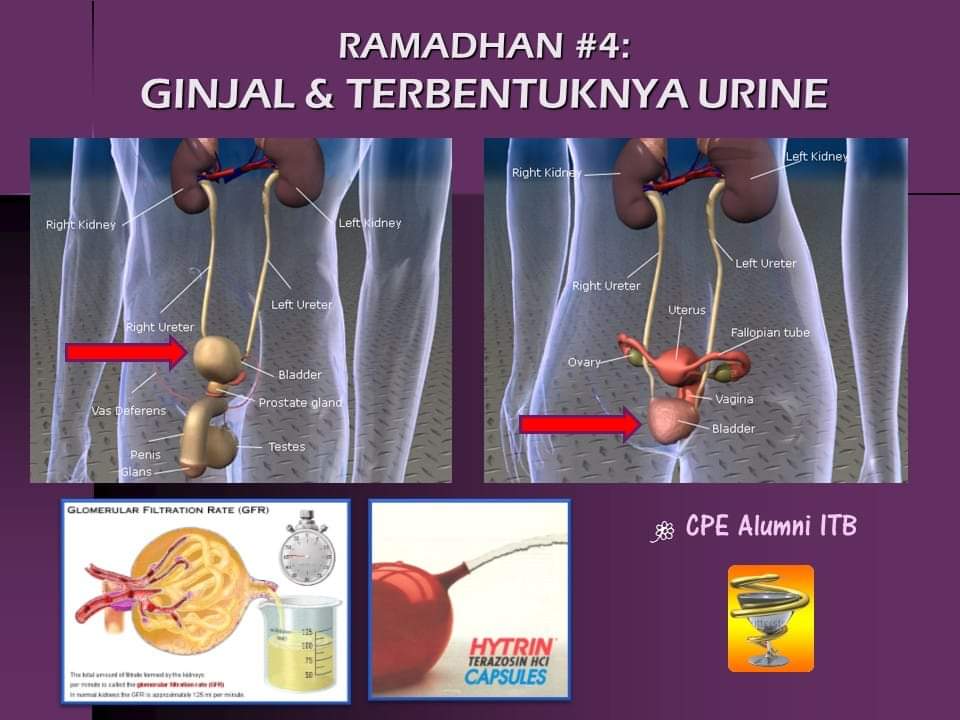 Selewat jam 10 pagi, seiring dengan sudah tidak adanya lagi pemasukan air minum, dan cadangan energi yang mulai berkurang, umumnya kebutuhan untuk buang air kecil sudah sangat mereda. Aktivitas ginjal sudah slow down. Ba'da shalat Dzuhur rasanya sudah tidak butuh ke toilet lagi. Aktivitas filtrasi, reabsorpsi dan sekresi ginjal mencapai titik terendah. Kenapa?